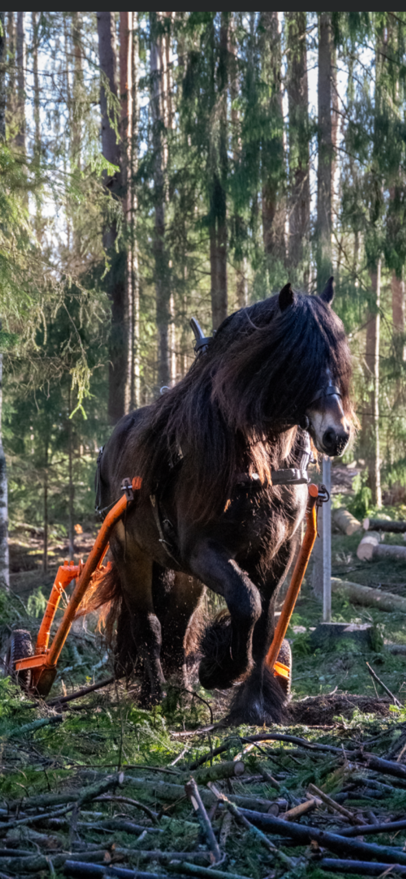 Mellegårds Gardar var beste UB-hingst av dølahestene under årets hingsteutstilling på Stav. Han viste seg som en stødig, arbeidsvillig hingst og gikk blant annet en rideprøve til karakteren 9. Her er han i aksjon og trekker tømmer under en skogdag hjemme på Flisa i mars. Foto: Ilja Strømstad.