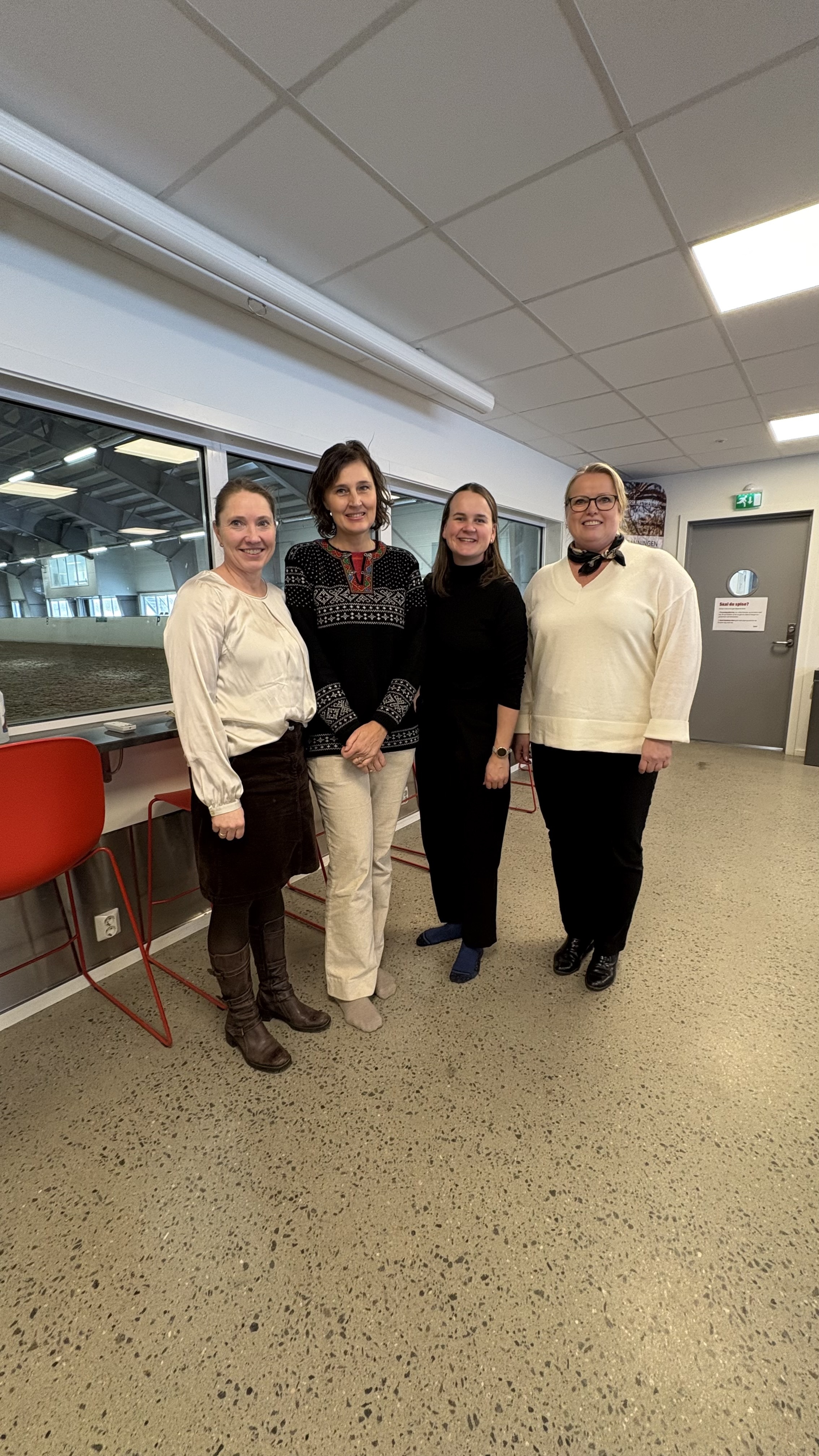 Foto: fra venstre, tidligere styreleder ved Norsk Hestesenter, Bente Odlo, som var med å ansette Cecilie. Deretter Cecilie og nåværende styreleder Marit K. Strand. Til høyre Torild Jakobsen, som overtok som styreleder etter Bente. Bente og Torild tok turen for å overraske og takke av Cecilie.
